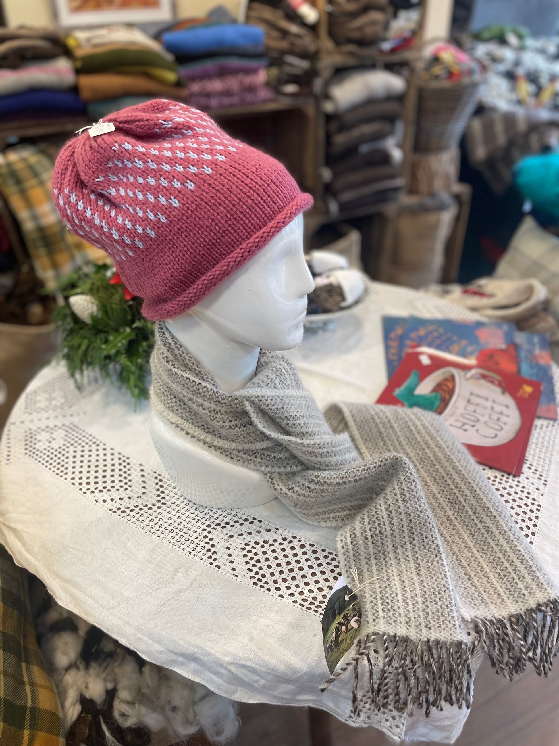 Long before she had the sheep, Lesley was a knitwear designer using a knitting machine. She now specialises in using her own wool and various products are available from the sheep as well as the knitwear.