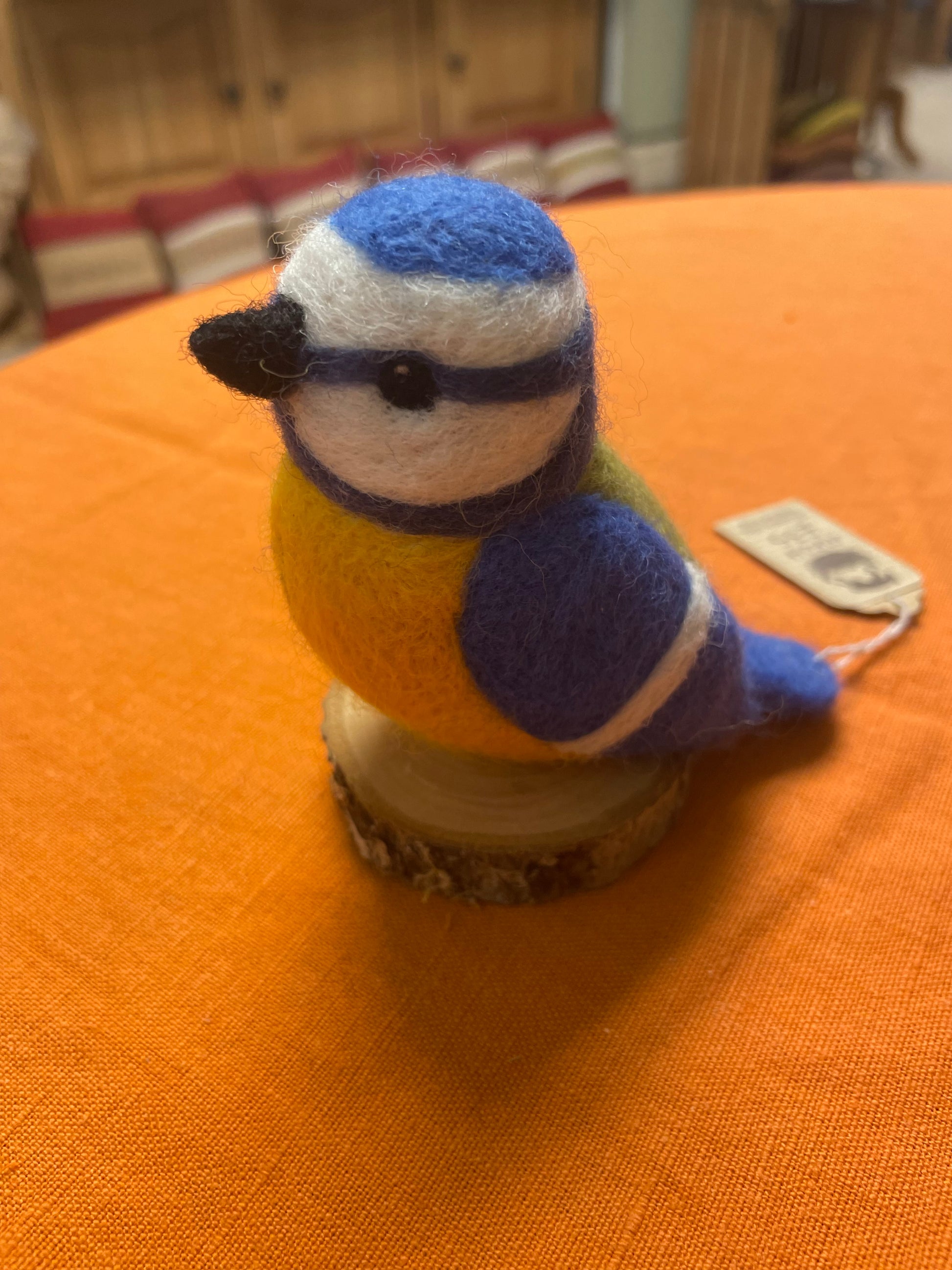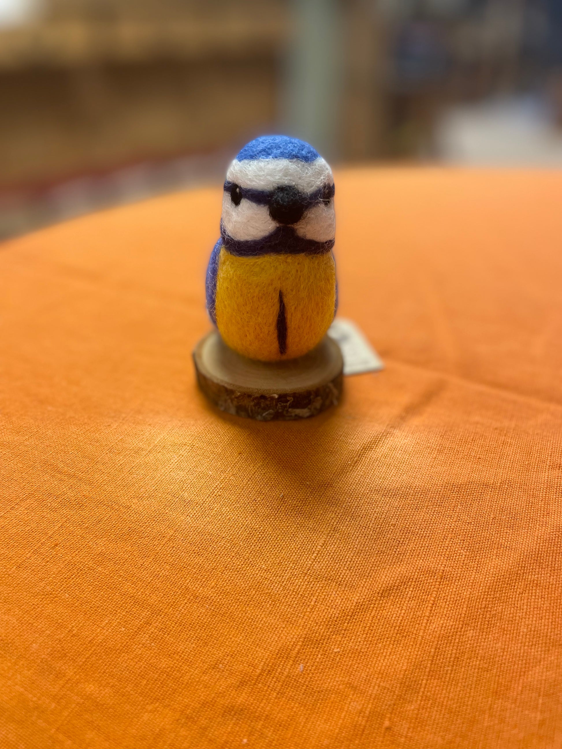 Made with 100% sheep wool, beautifully detailed Blue tit mounted on wooden block created by Megan Pugh, wildlife artist and illustrator.