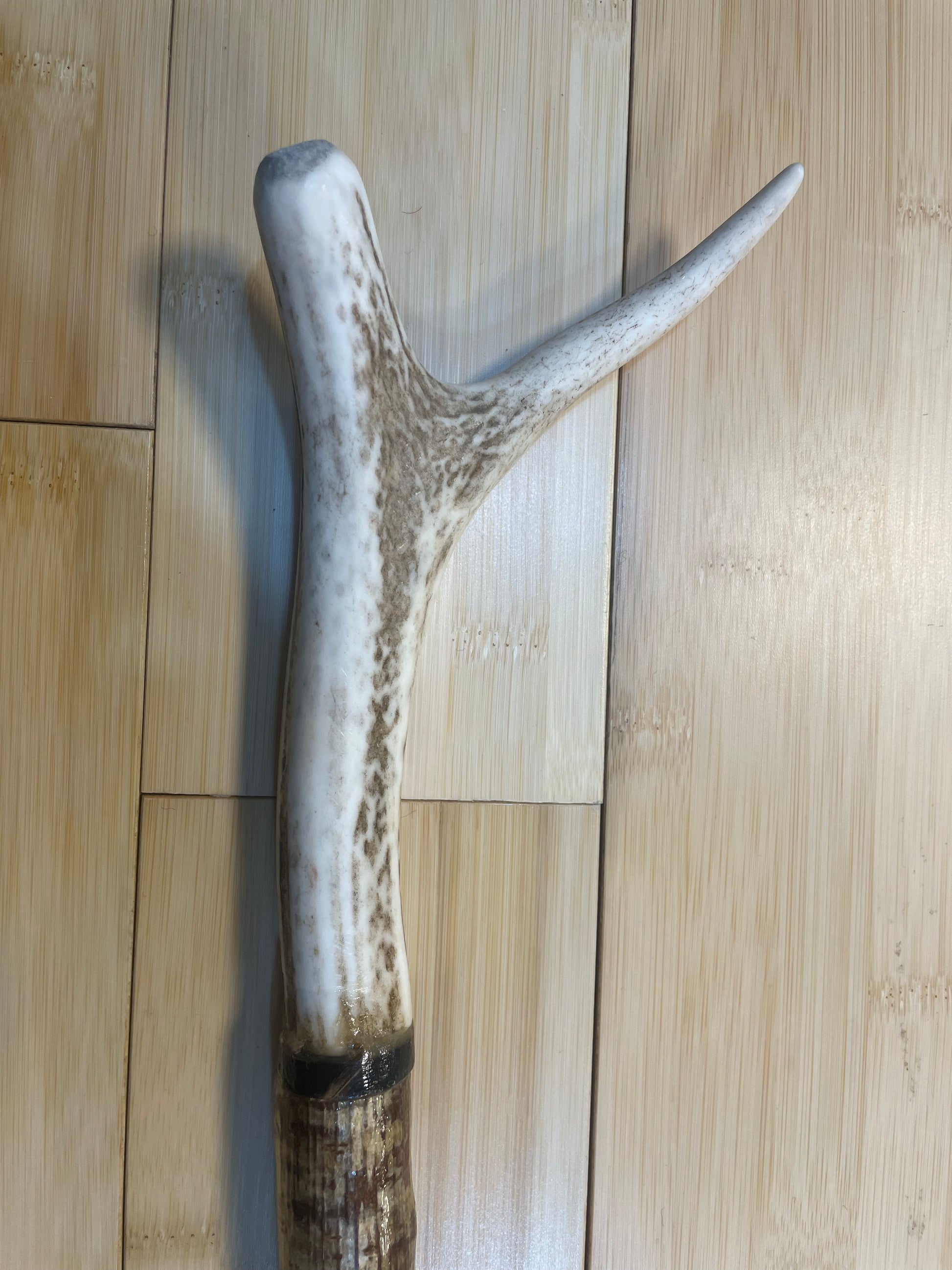 The staghorn handle has been expertly sanded and polished to create a smooth and comfortable grip, offering excellent support and control while hiking, walking, or navigating uneven terrain. The handle is attached to a sturdy dark brown hardwood shaft, combining durability with classic style.