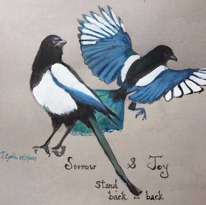Experience the duality of emotions with our original framed painting, 'Two Magpies: Sorrow and Joy,' by Jennifer Goslin. Now available as an A5 Blank Greeting Card, this artwork captures the poignant imagery of two magpies standing back to back. Share the depth of emotion with this card—a unique canvas for your personal messages and a thoughtful way to convey both sorrow and joy.