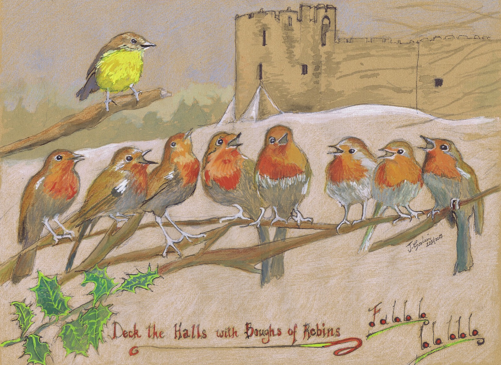Deck the Halls with Boughs of Robins original design by artist Jennifer Goslin in mixed media; gouache, dipped ink and penicillin, inspired by a Welsh choir, the leader has the yellow breast of an Asian Robin just for clarity. Chepstow Castle is the backdrop.