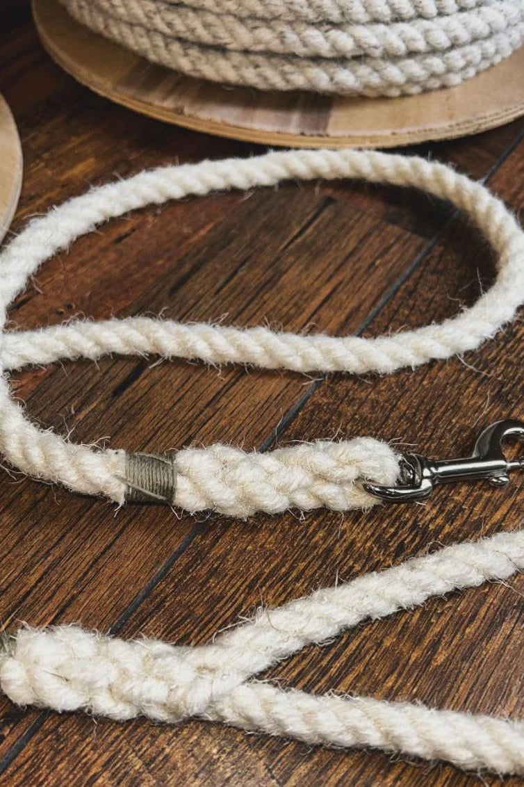Sustainable Rope's dog leads are expertly constructed from our specially sourced 3 ply 8mm, 10mm or 12mm 100% British Wool Welsh rope, a luxurious and natural material known for its strength and resilience. The light white colour adds a touch of elegance to the overall aesthetic, perfectly complementing your furry friend's style.