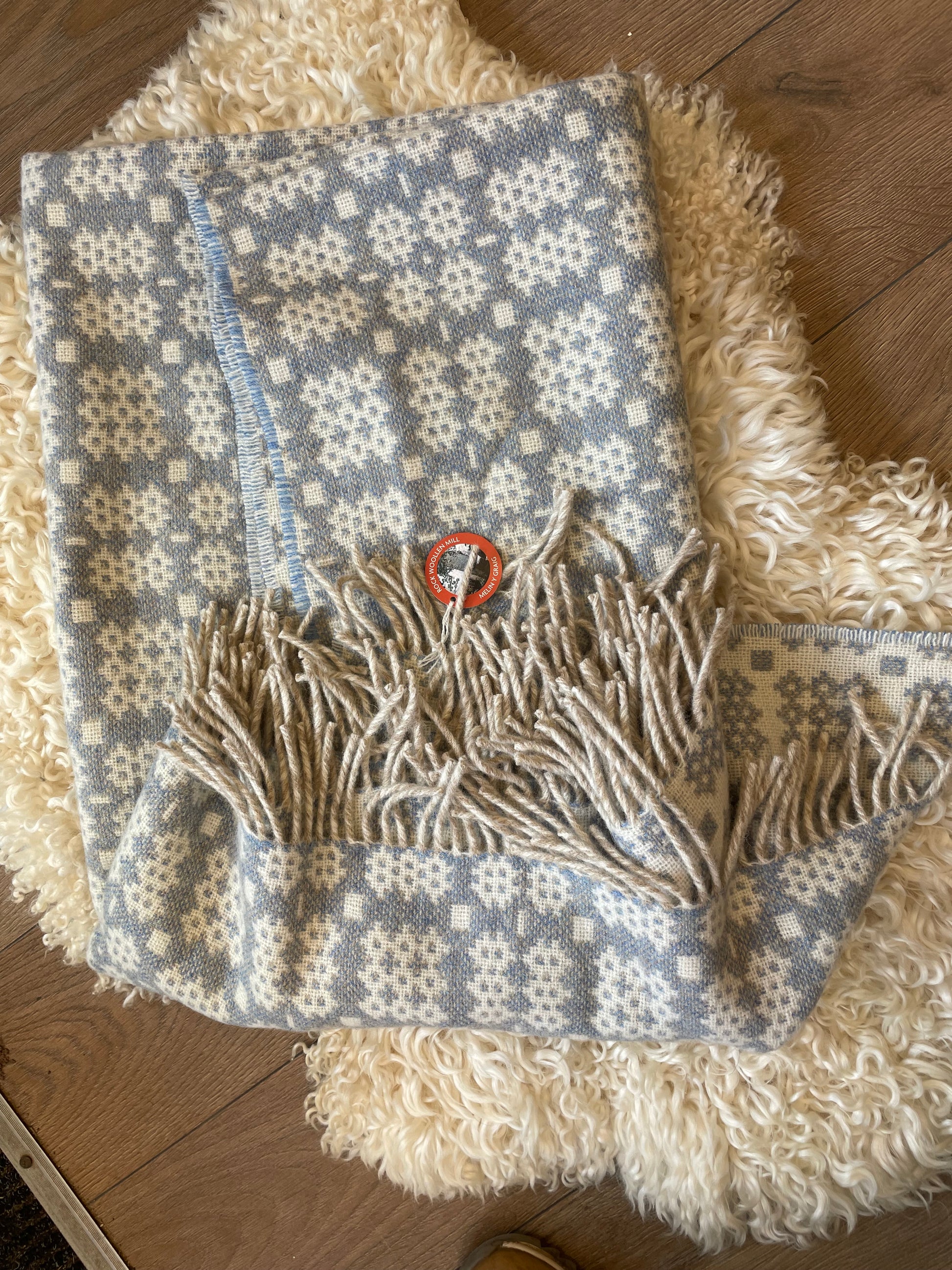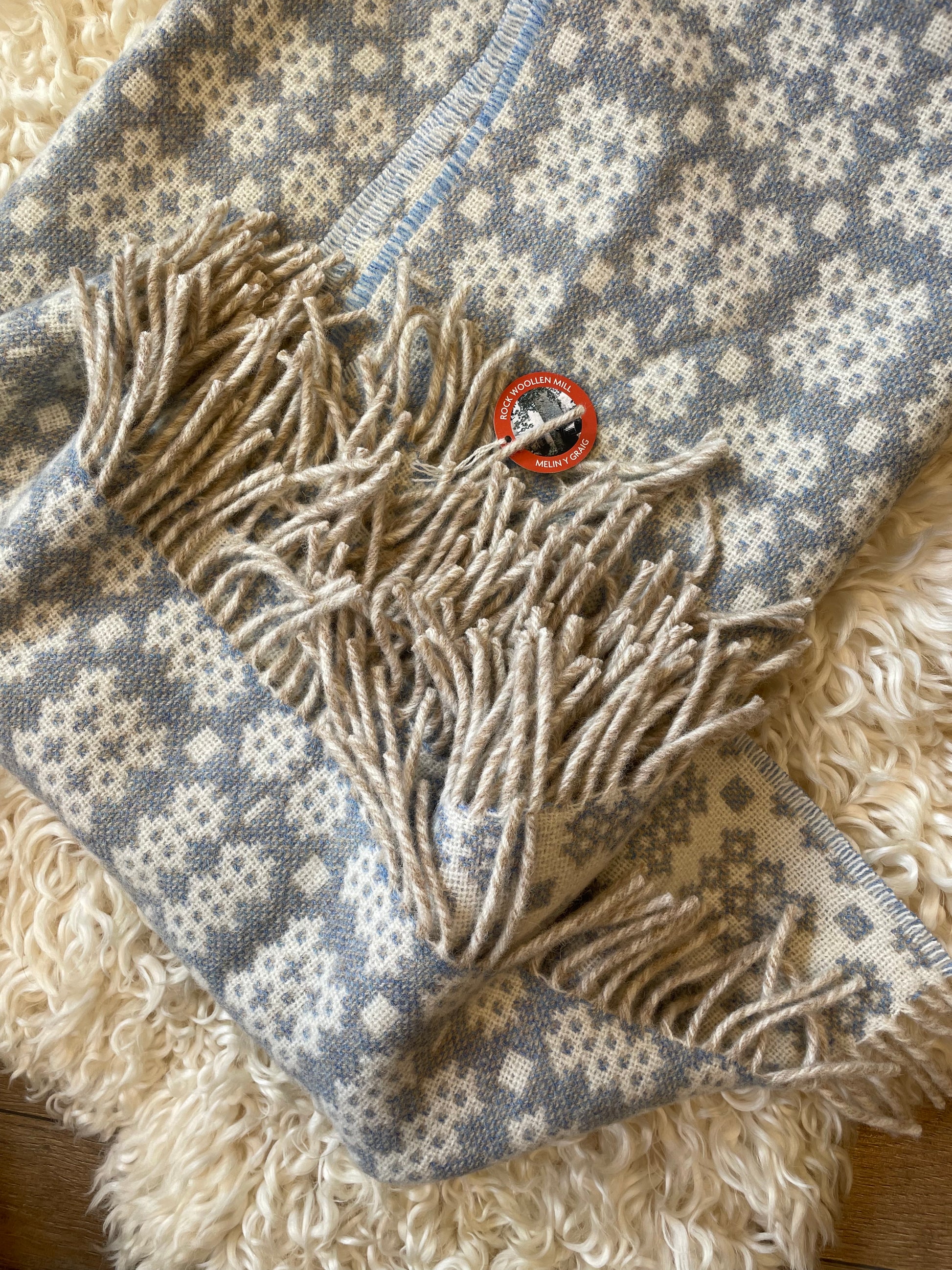 A 100% British wool blanket, woven in Wales as part of the iconic and historic Caernarfon portcullis design. A beautiful and stylish addition to any room in your home. This Welsh blanket is soft to touch and will keep you warm and cosy on those chilly days and evenings. Glas Ia is woven in a soft Ice Blue weft and a two-tone cream warp.
