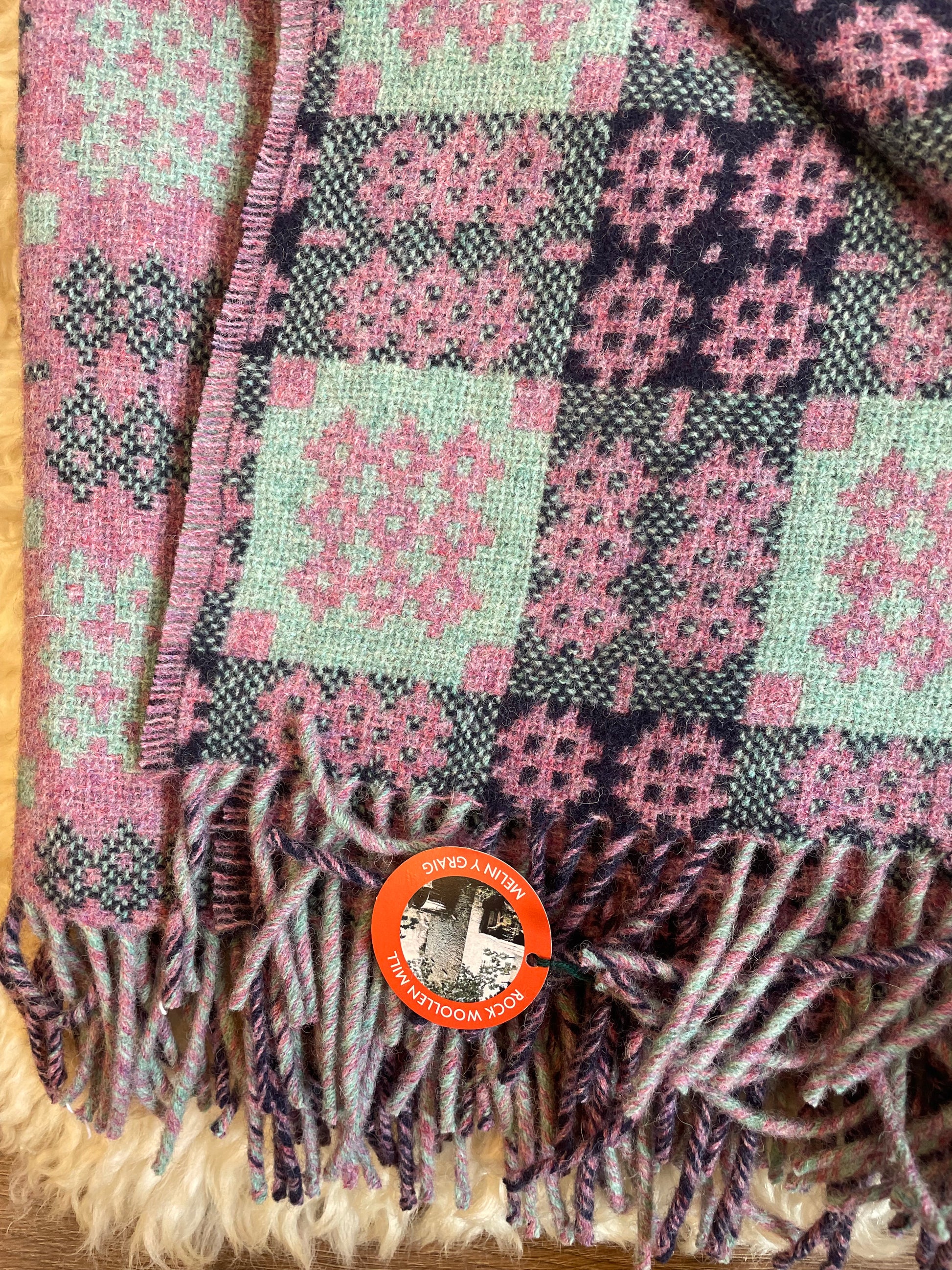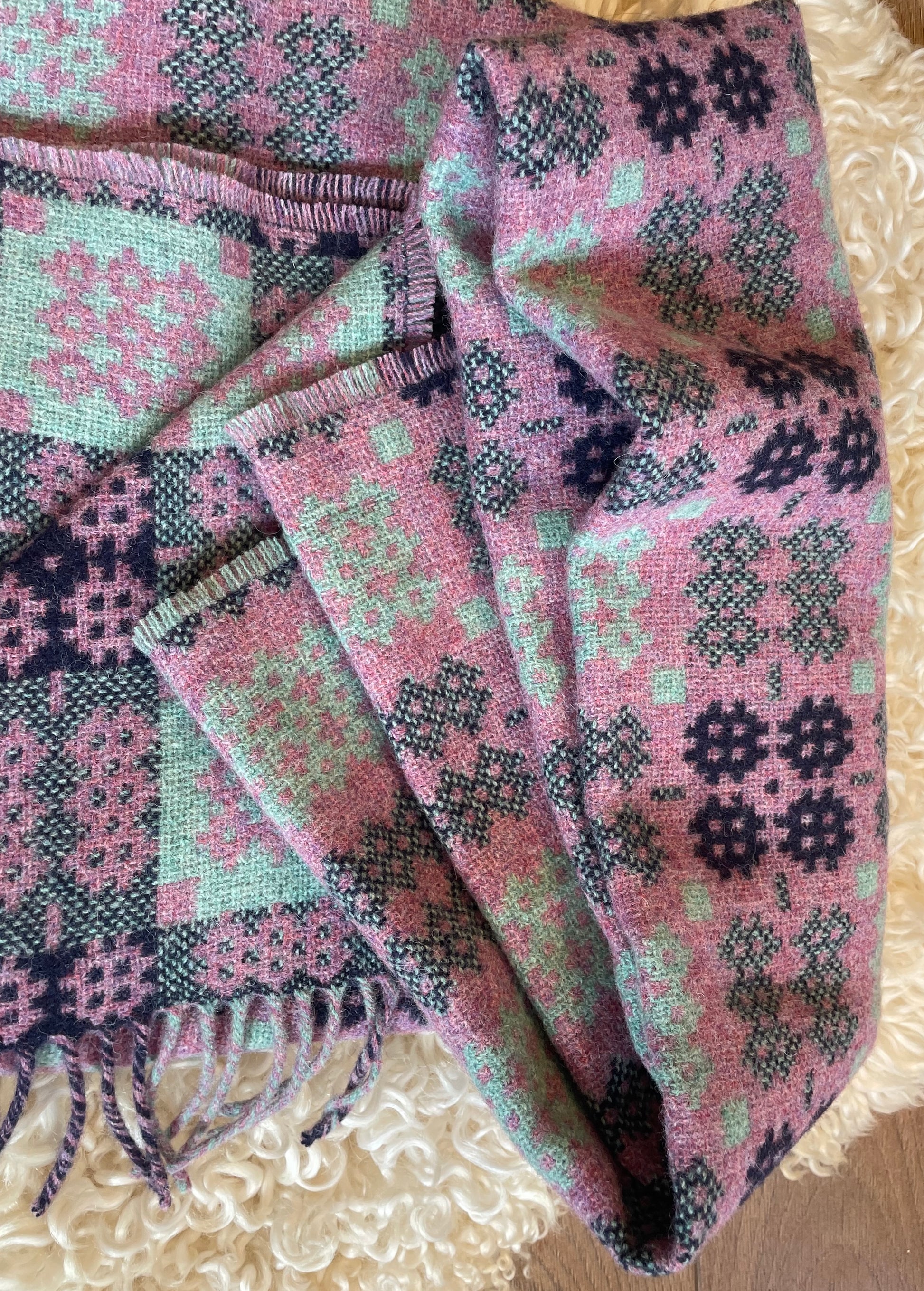A 100% British wool blanket, woven in Wales as part of the iconic and historic Caernarfon portcullis design. A beautiful and stylish addition to any room in your home. This Welsh blanket is soft to touch and will keep you warm and cosy on those chilly days and evenings. Woven in Heather, Mint and dark navy.