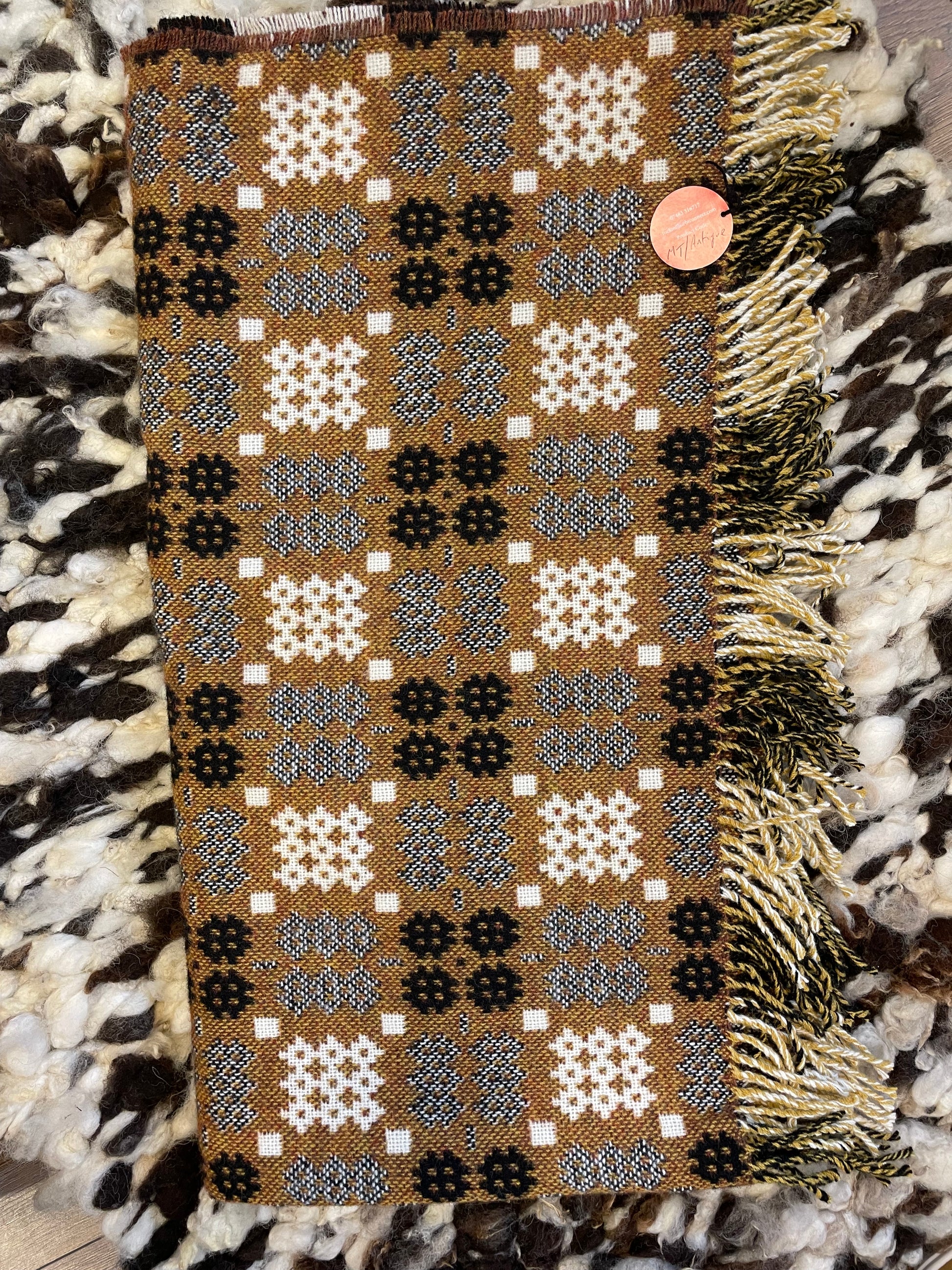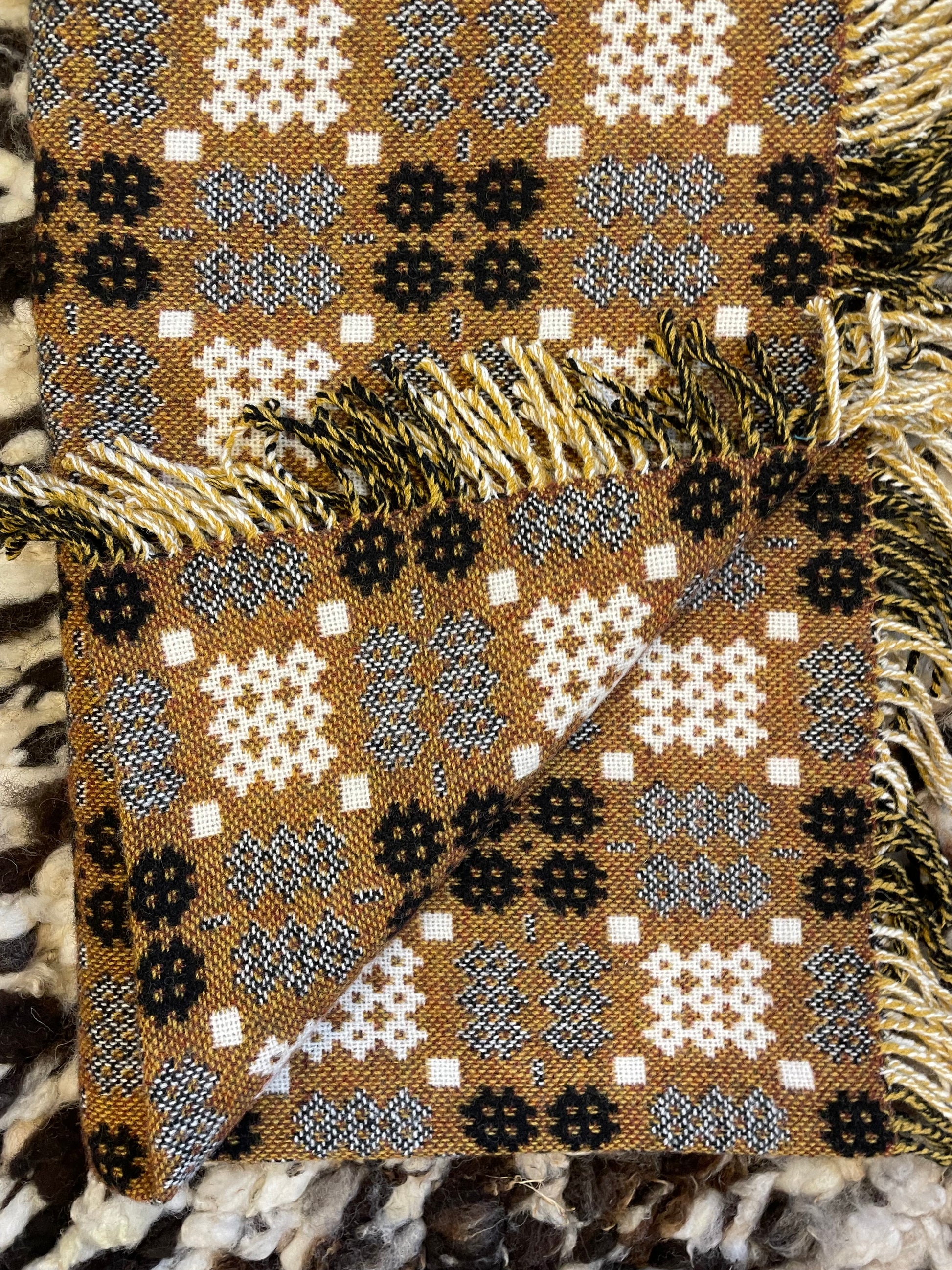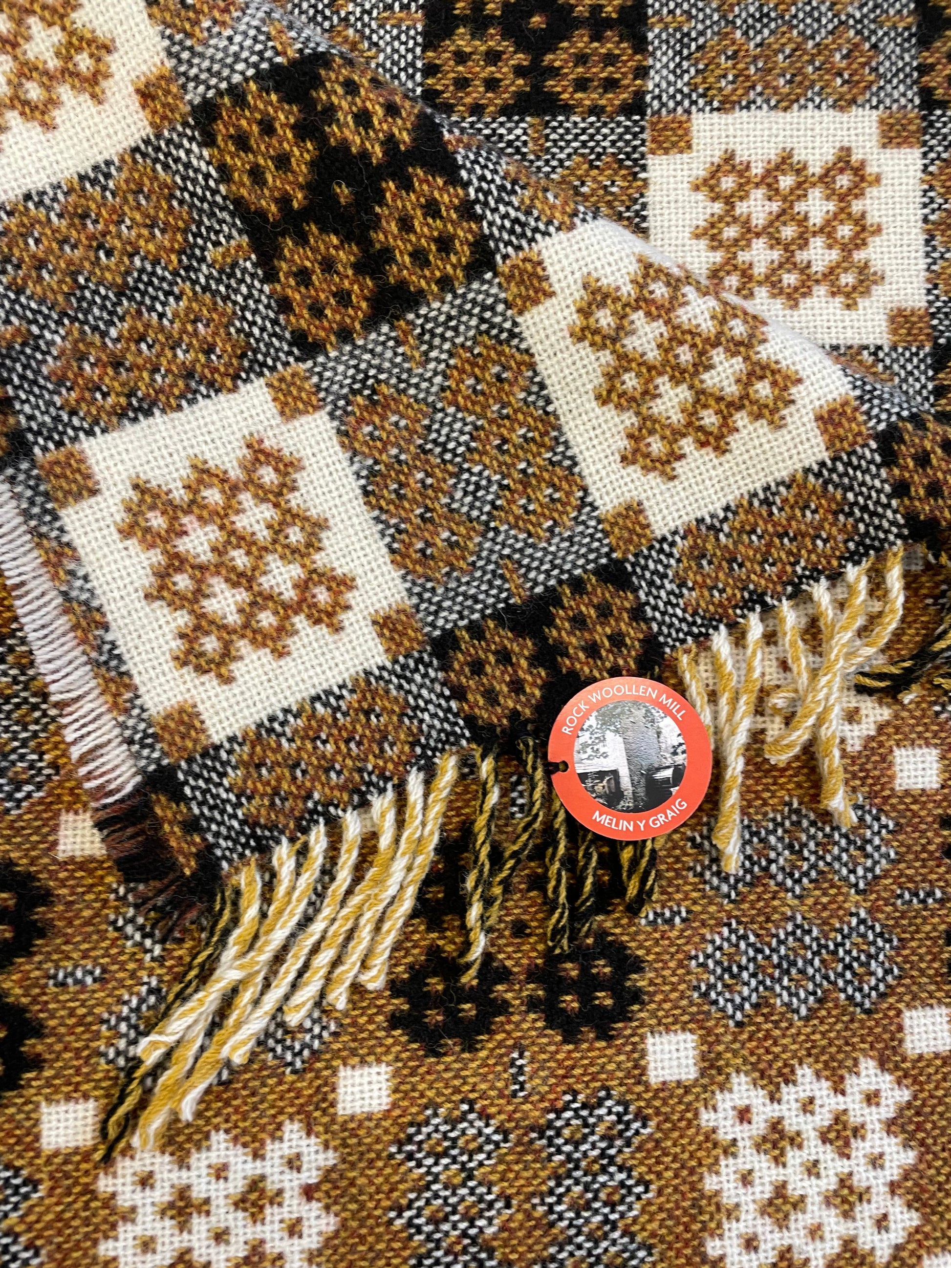 A 100% British wool blanket, woven in Wales as part of the iconic and historic Caernarfon portcullis design. A beautiful and stylish addition to any room in your home. This Welsh blanket is soft to touch and will keep you warm and cosy on those chilly days and evenings. Hynafol is woven in Nutmeg, Amber, Black and Cream.